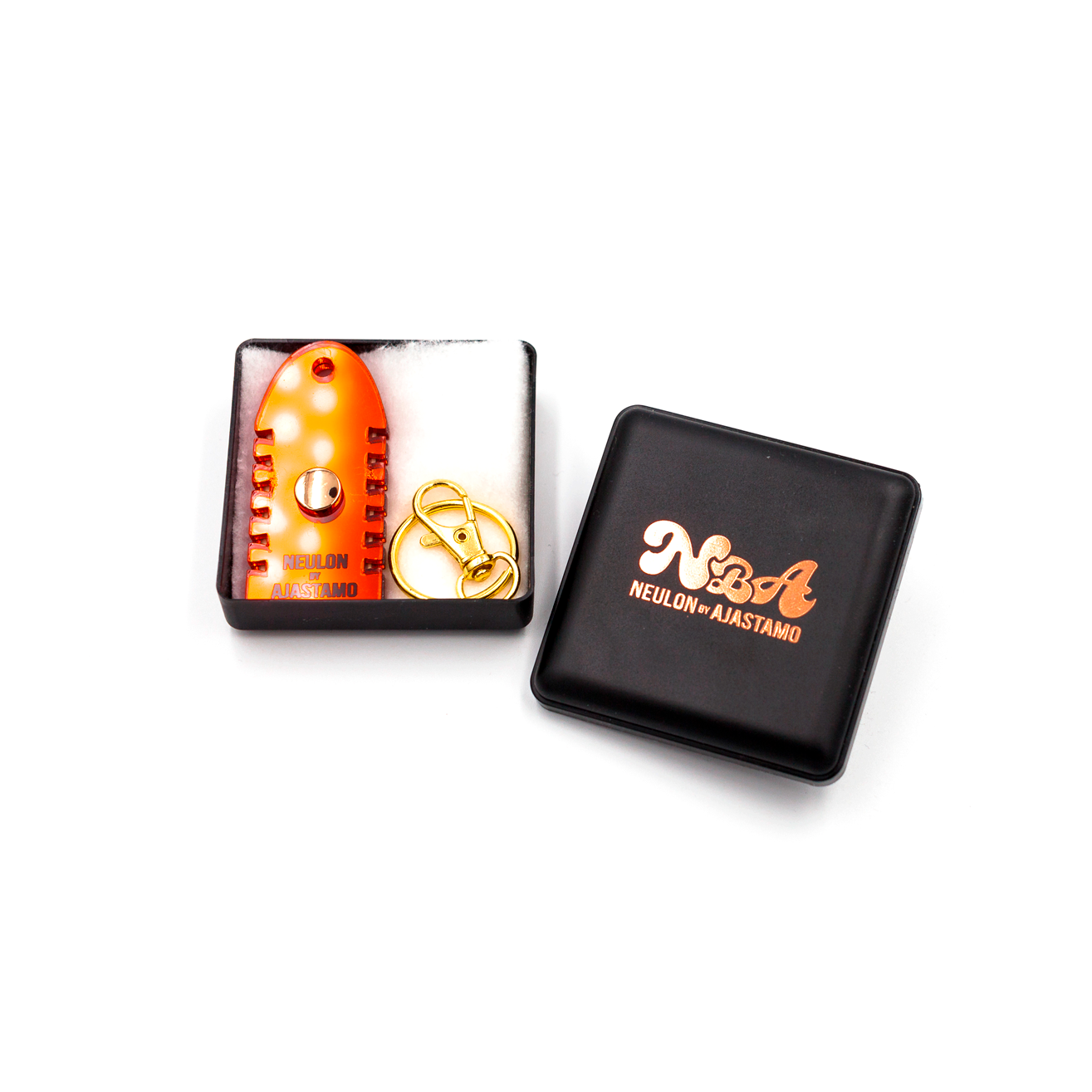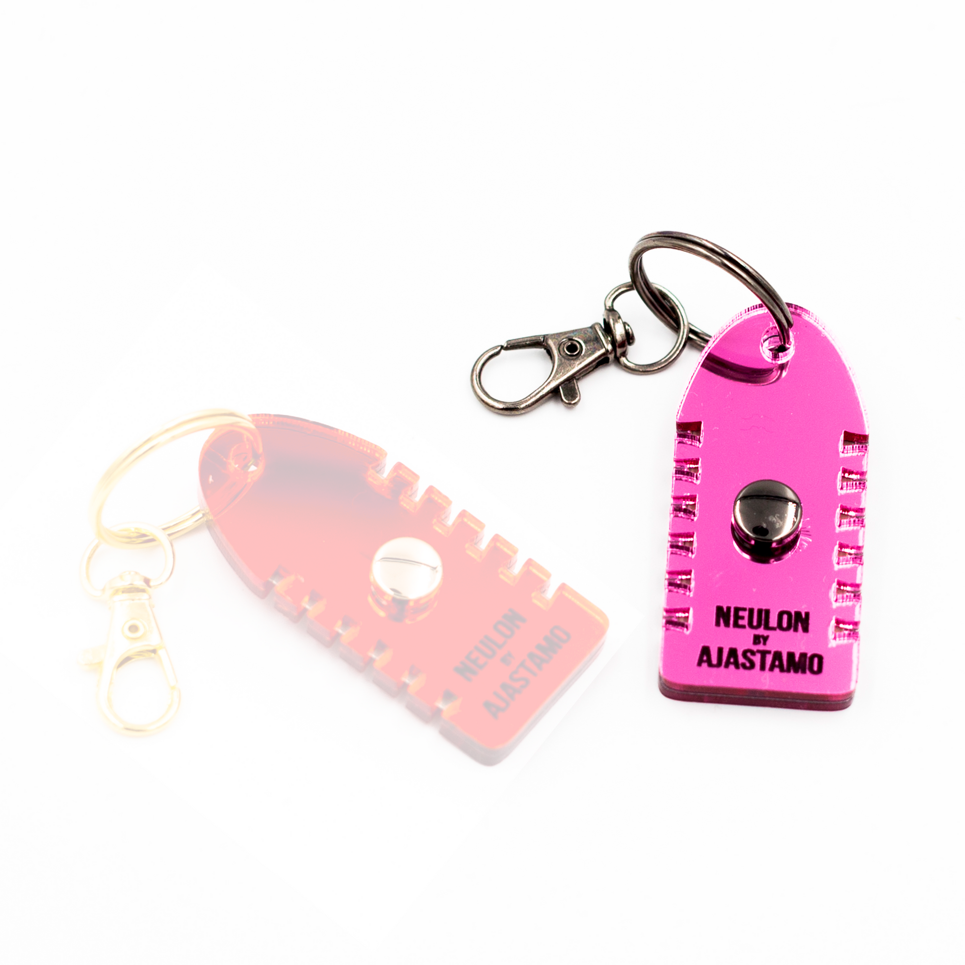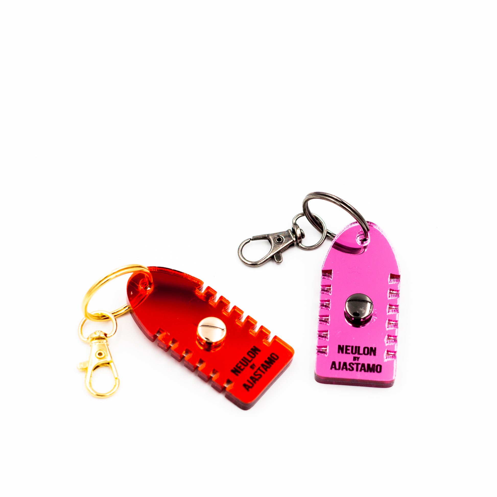 Saatavilla kahdessa eri värissä, punaisena ja pinkkinä. Pinkissä musta niitti ja avainrengas, punaisessa kullan väriset. Koko ilman avainlenkkiä ja papukaijalukkoa 57x26x5mm.
