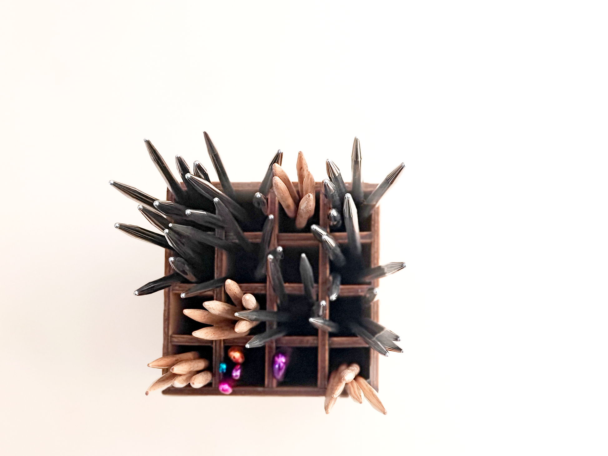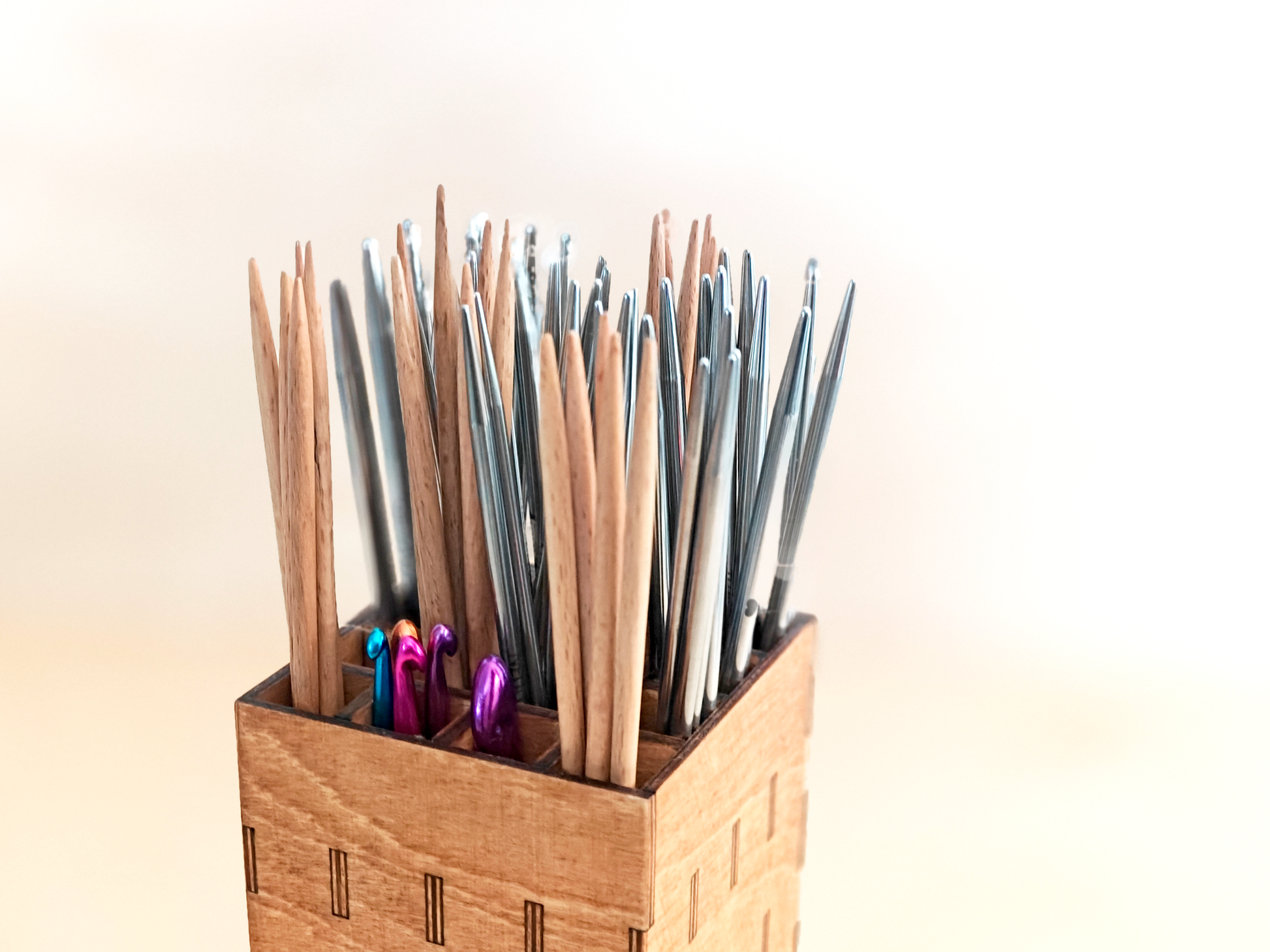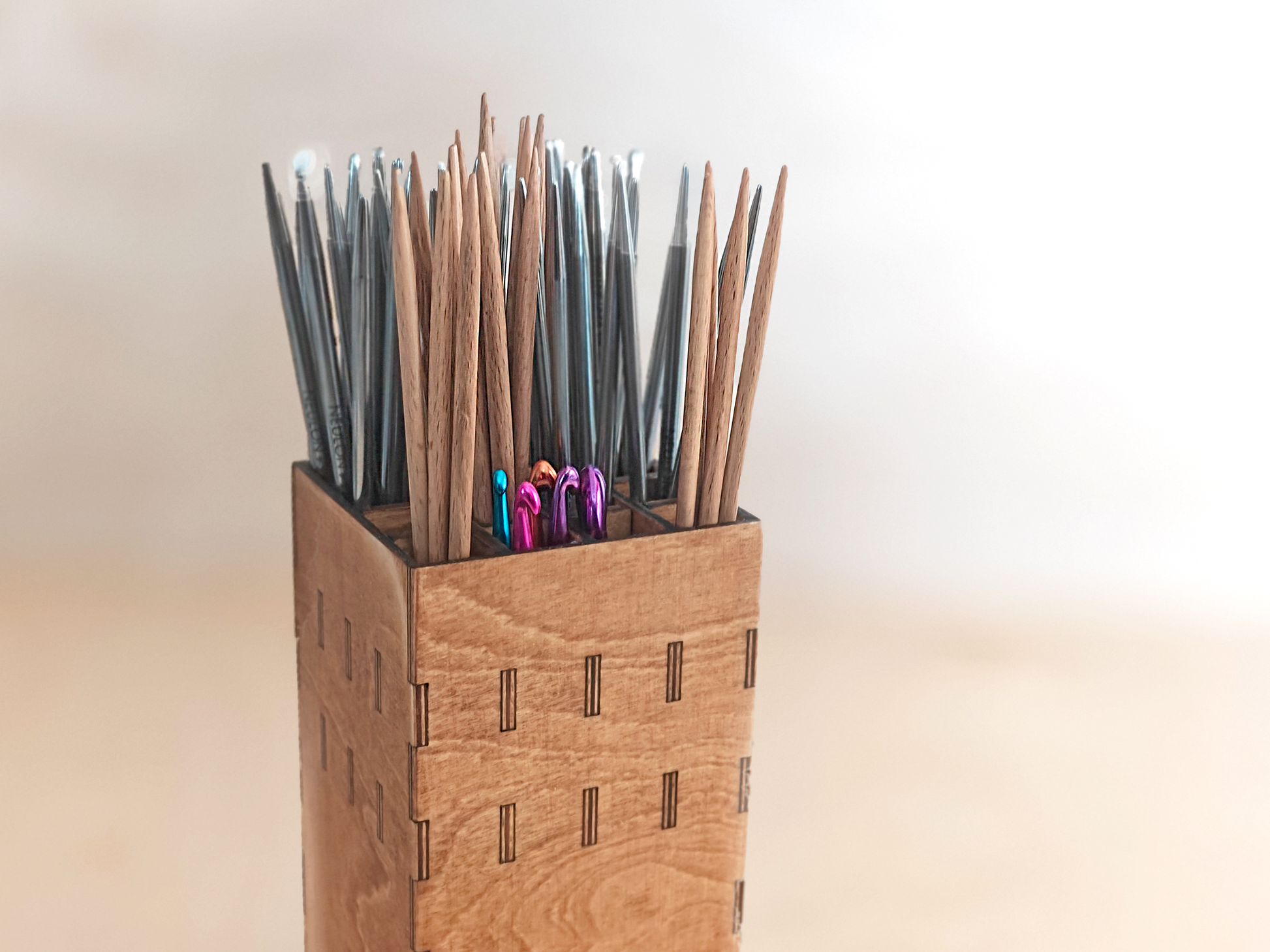 Tyylikäs ja käytännöllinen teline neulepuikoille. Valmistettu kotimaisesta 3mm koivuvanerista ja sävytetty turvallisella kuullotteella, joka tuo puun kuviot kauniisti esille.
