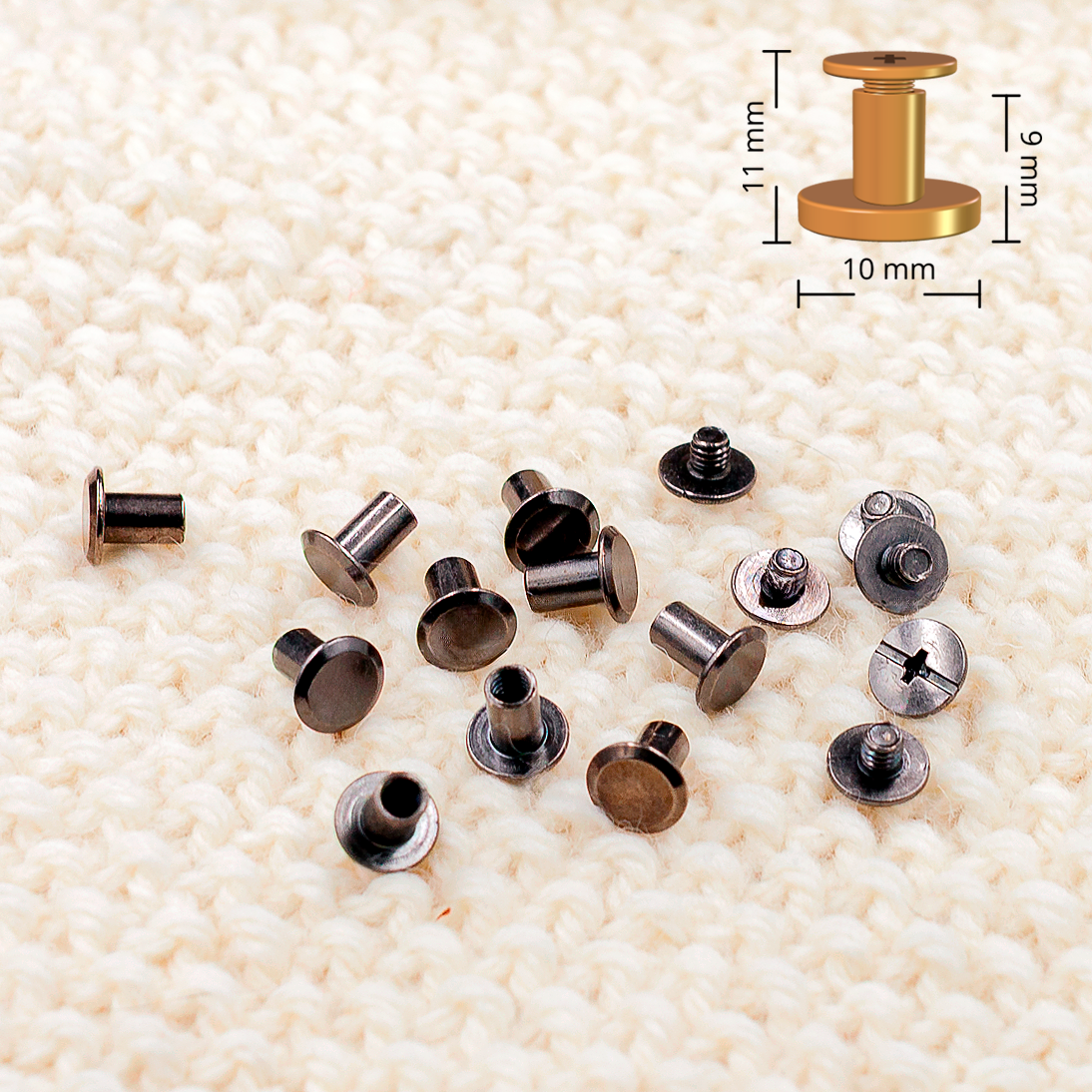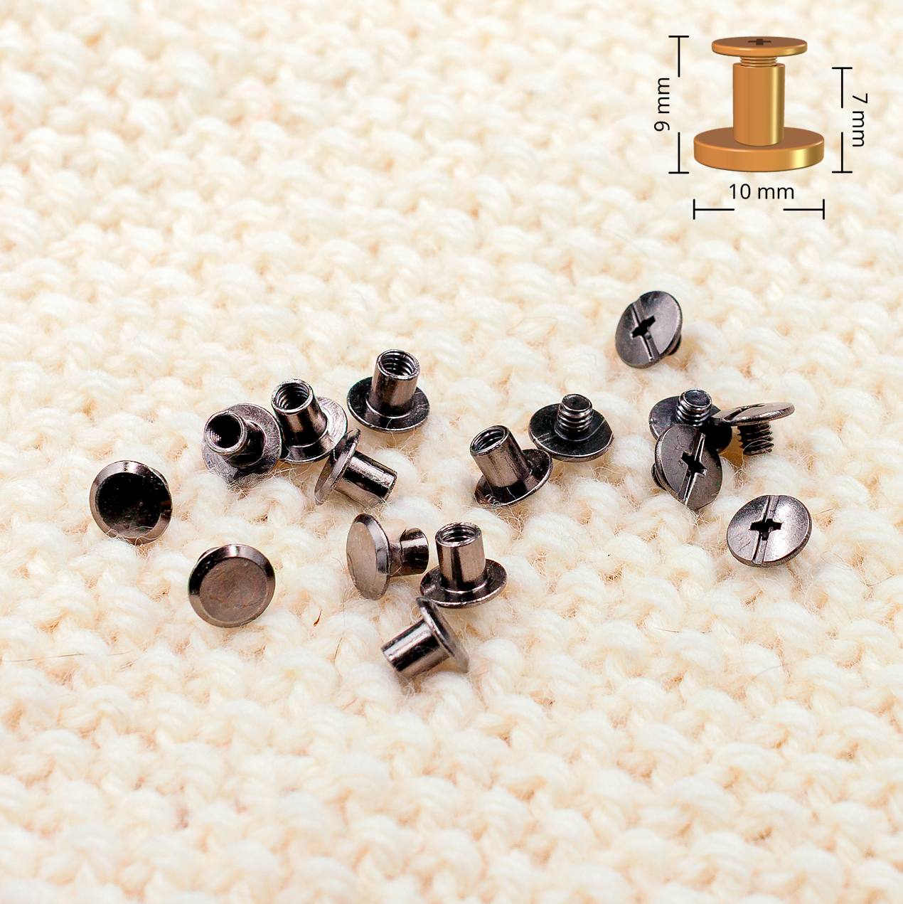 Lattapäinen ruuviniitti halkaisija 9-10mm. Valmistettu sinkki-seoksesta. Saatavilla neljässä värissä; kulta, hopea, musta/grafiitti ja pronssi. Mustaa/grafiitti ja pronssi saatavilla 5, 7 ja 9mm pituuksissa.